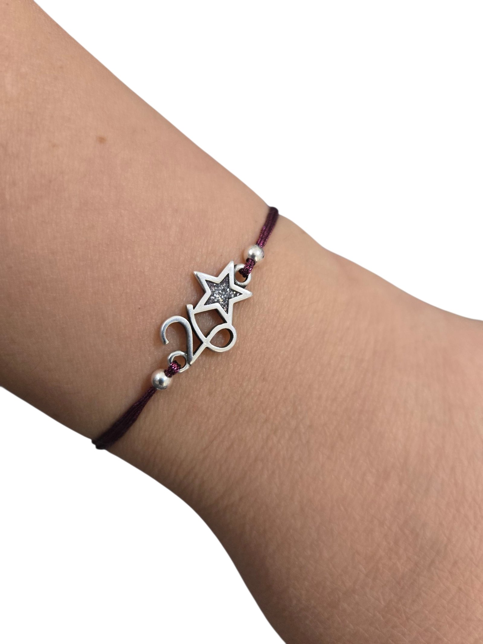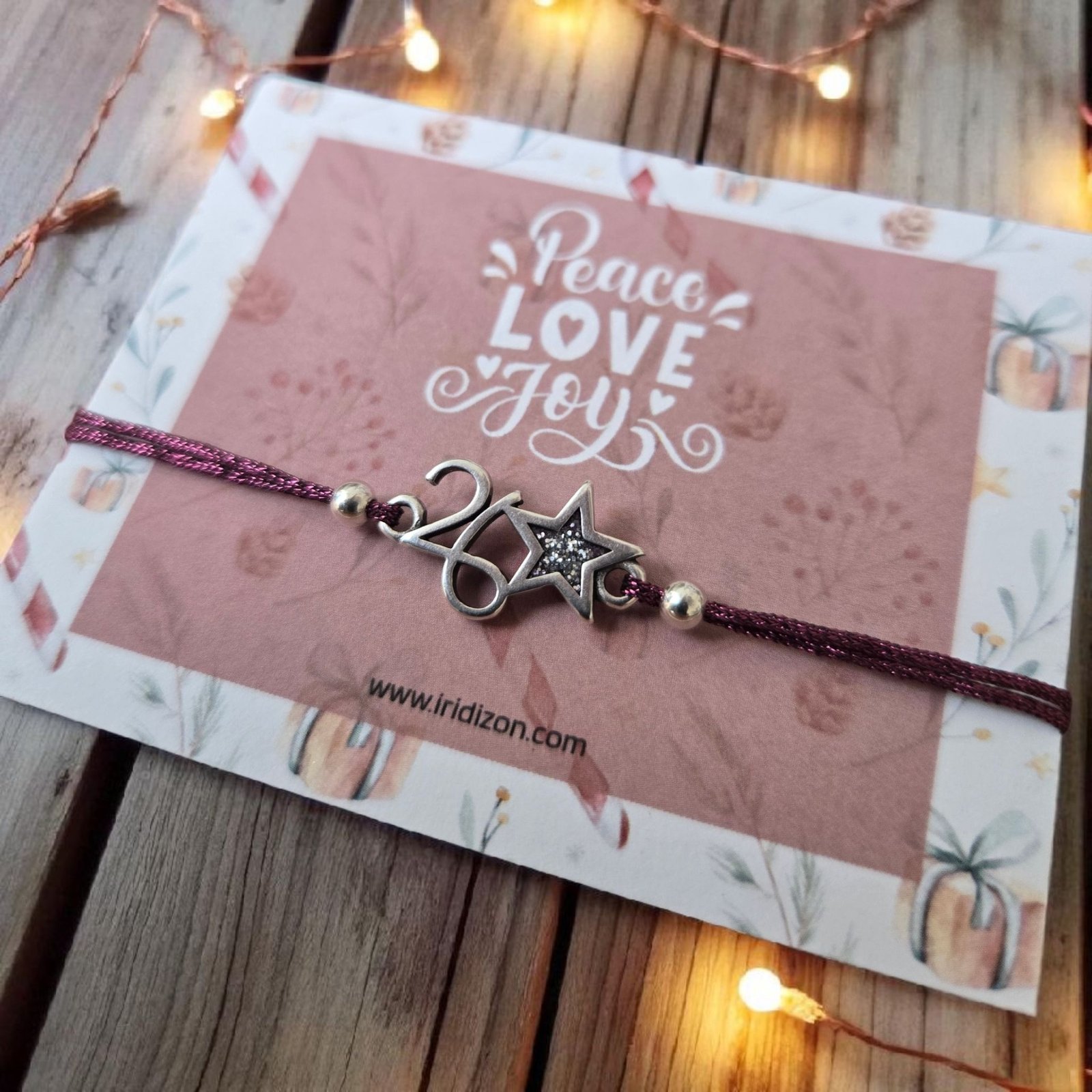Καλωσόρισε το 2026 με ένα γούρι-βραχιόλι που συνδυάζει στυλ και θετική ενέργεια! Χειροποίητο βραχιόλι με μοτίφ “26” και σύμβολο αστέρι με σμάλτο σε ασημί glitter. Σε επάργυρο ή επίχρυσο ζάμακ, δεμένο με μπορντώ μεταλλιζέ κορδονάκι και δέσιμο με κούμπωμα σιλικόνης για εύκολη αυξομείωση μεγέθους, ώστε να ταιριάζει σε κάθε καρπό. Μαζί με κάρτα ευχών για τη νέα χρονιά. Κωδικός επίχρυσου 2438, κωδικός επάργυρου 2439