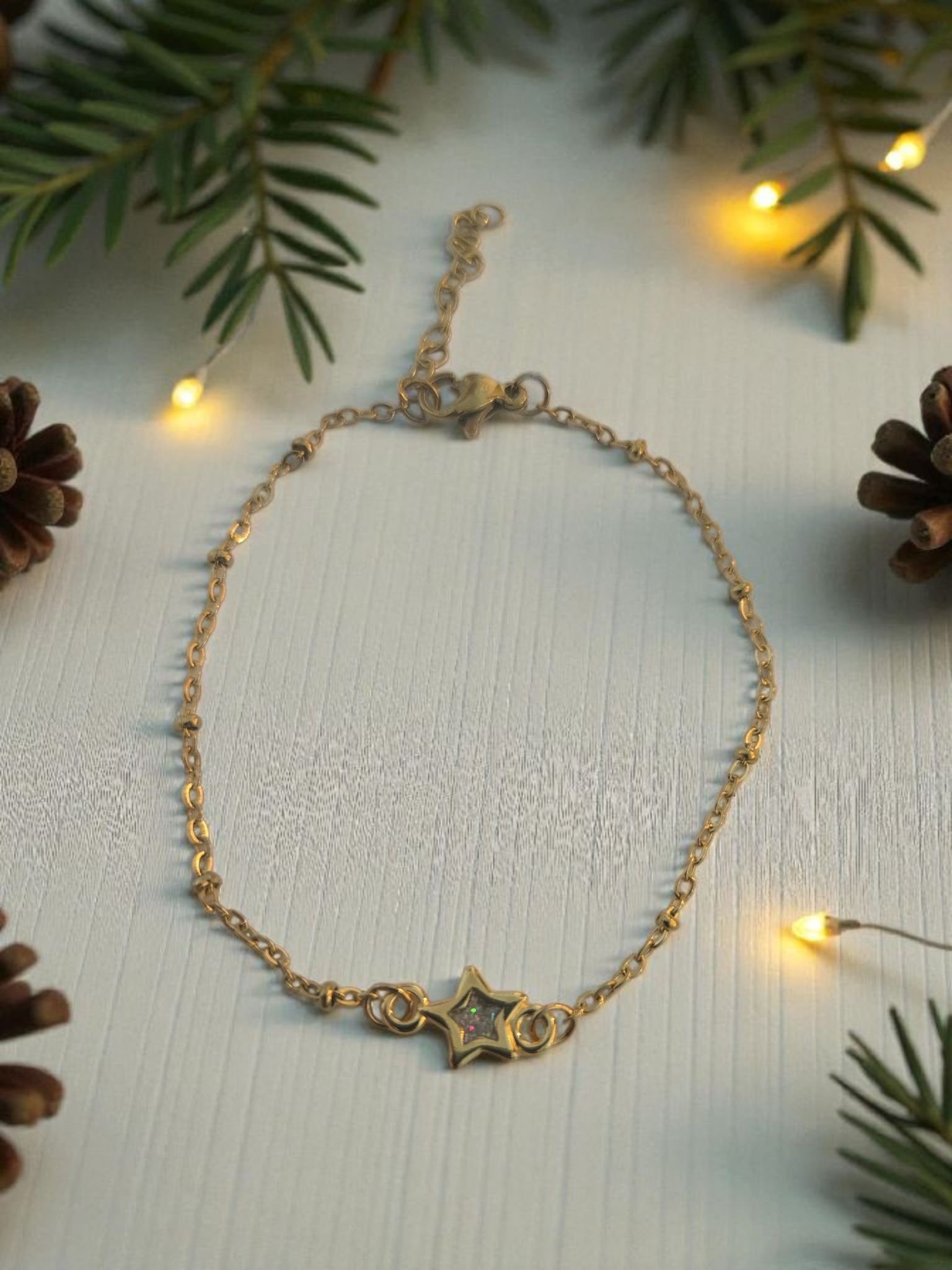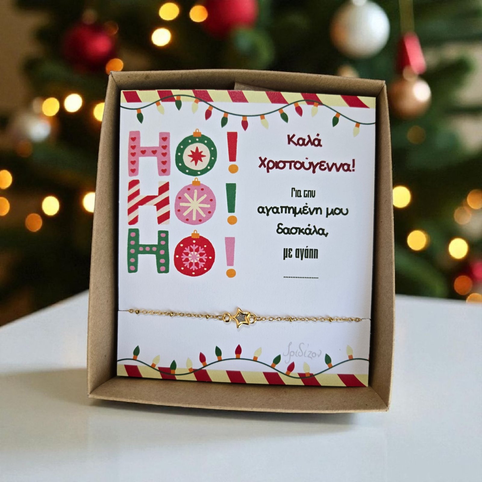 Ένα ξεχωριστό δώρο για τη δασκάλα μας που τόσο αγαπάμε! Χειροποίητο βραχιόλι με μοτίφ αστεράκι με σμάλτο σε ασημί glitter, από επίχρυσο ζάμακ, δεμένο με επίχρυση ατσάλινη αλυσίδα σε σχέδιο τύπου ροζάριο. Μαζί με κάρτα ευχών για τη νέα χρονιά. Κωδικός 2476