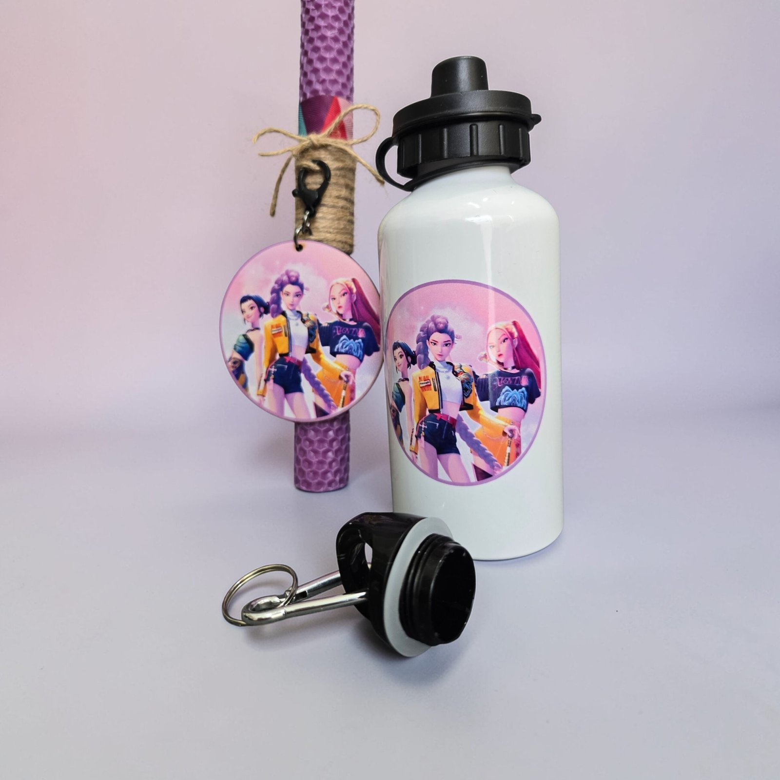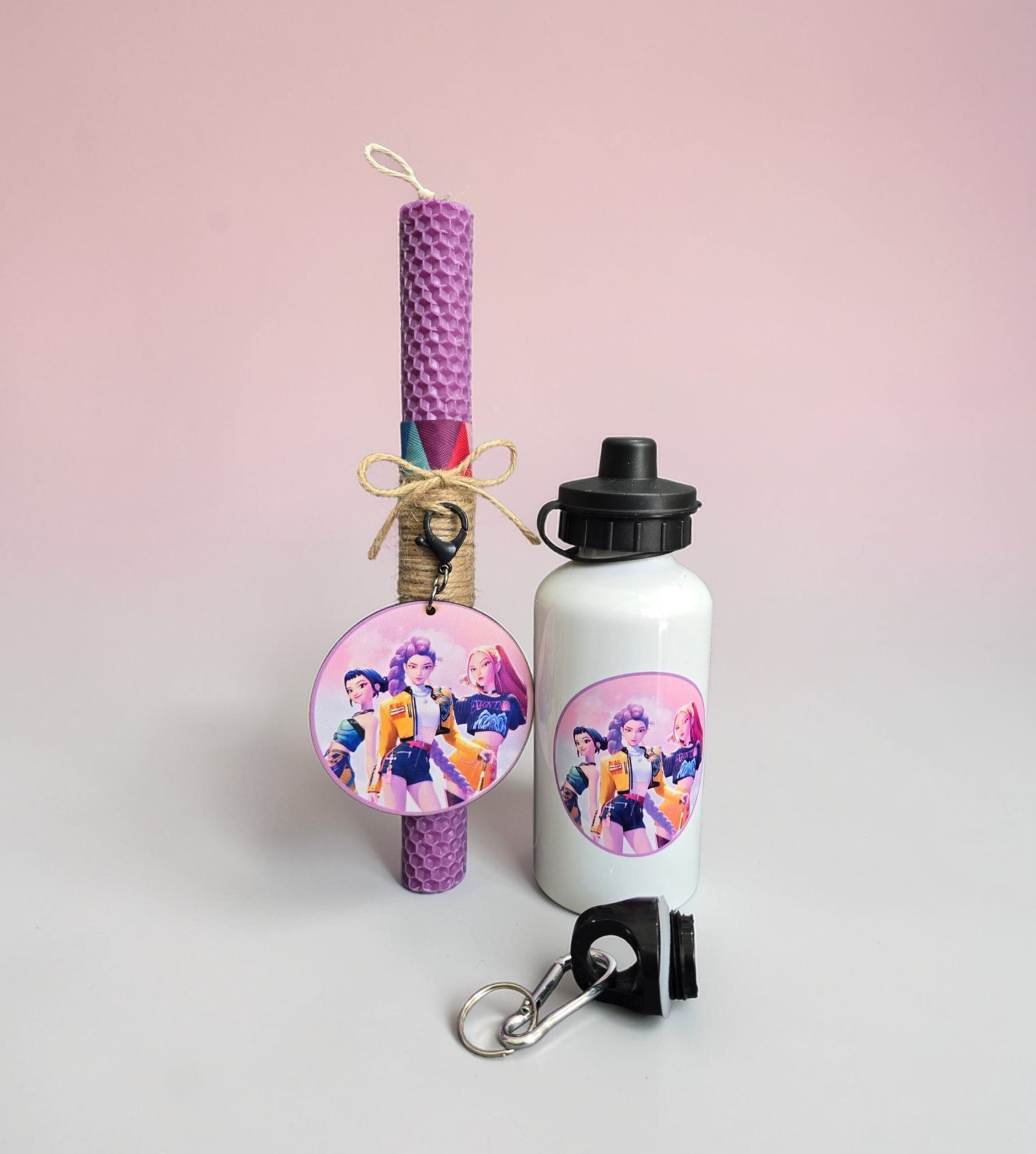 Χειροποίητη λαμπάδα με παγούρι, διακοσμημένη με ένα ξύλινο μπρελόκ με θέμα Huntrix Kpop. Το μπρελόκ μπορεί να χρησιμοποιηθεί μετά το Πάσχα ως αξεσουάρ για κλειδιά ή τσάντες, κρατώντας ζωντανή την ανάμνηση της ιδιαίτερης αυτής ημέρας. Η λαμπάδα συνοδεύεται από ένα παγούρι με εκτύπωση στο ίδιο θέμα, δημιουργώντας ένα ολοκληρωμένο και χαρούμενο πασχαλινό δώρο.