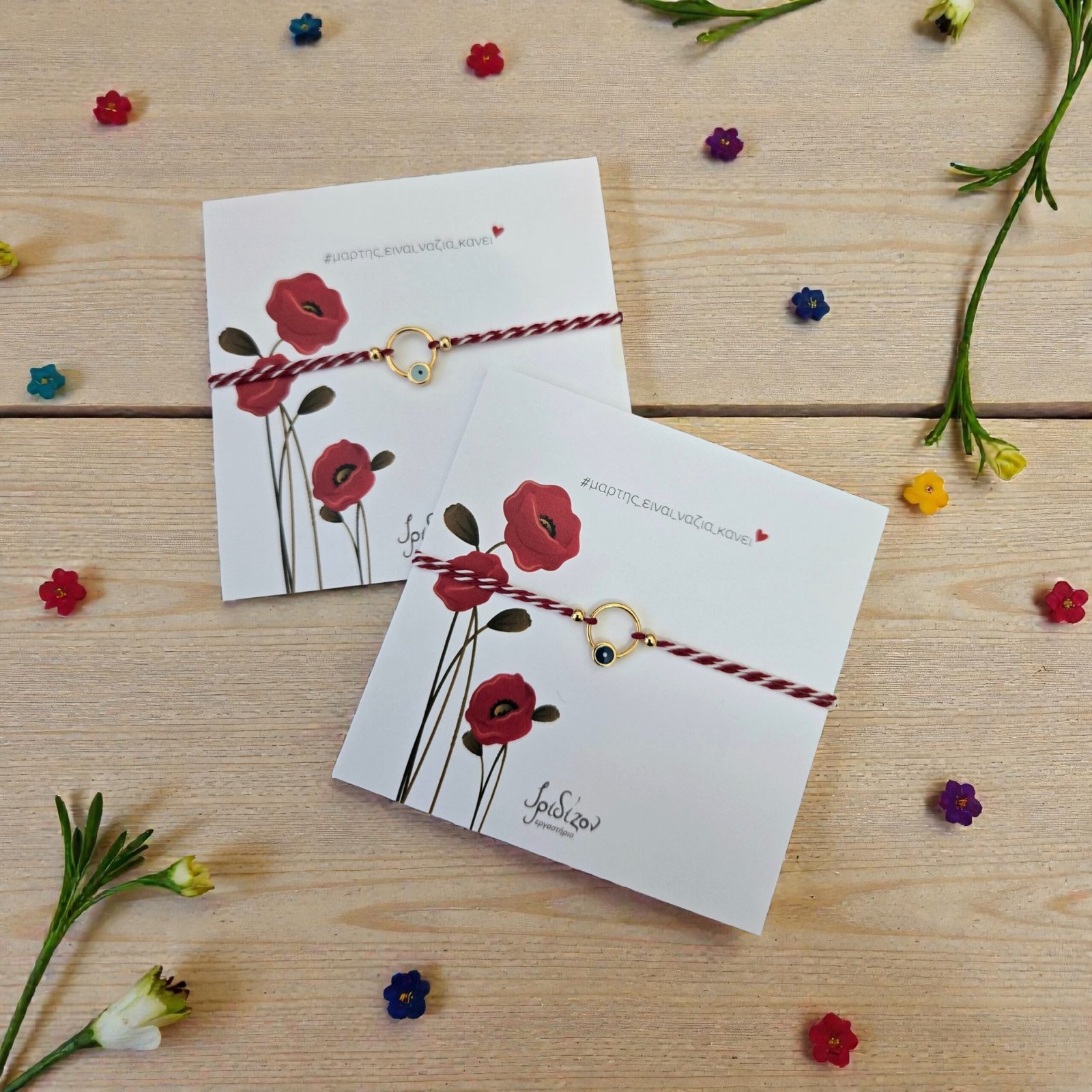 Το βραχιόλι μαρτάκι μάτι κύκλος με σμάλτο σε μπλε και γαλάζιο χρώμα είναι από επίχρυσο ζάμακ. Το παραδοσιακό κορδόνι σε λευκό και κόκκινο χρώμα, συμβολίζει την προστασία από τον ήλιο και την καλή τύχη για τον ερχομό της άνοιξης. Το κλείσιμο του είναι μακραμέ, για αυξομείωση. Ιδανικό για να το φορέσετε ή να το χαρίσετε ως συμβολικό δώρο! Κωδικός 2523