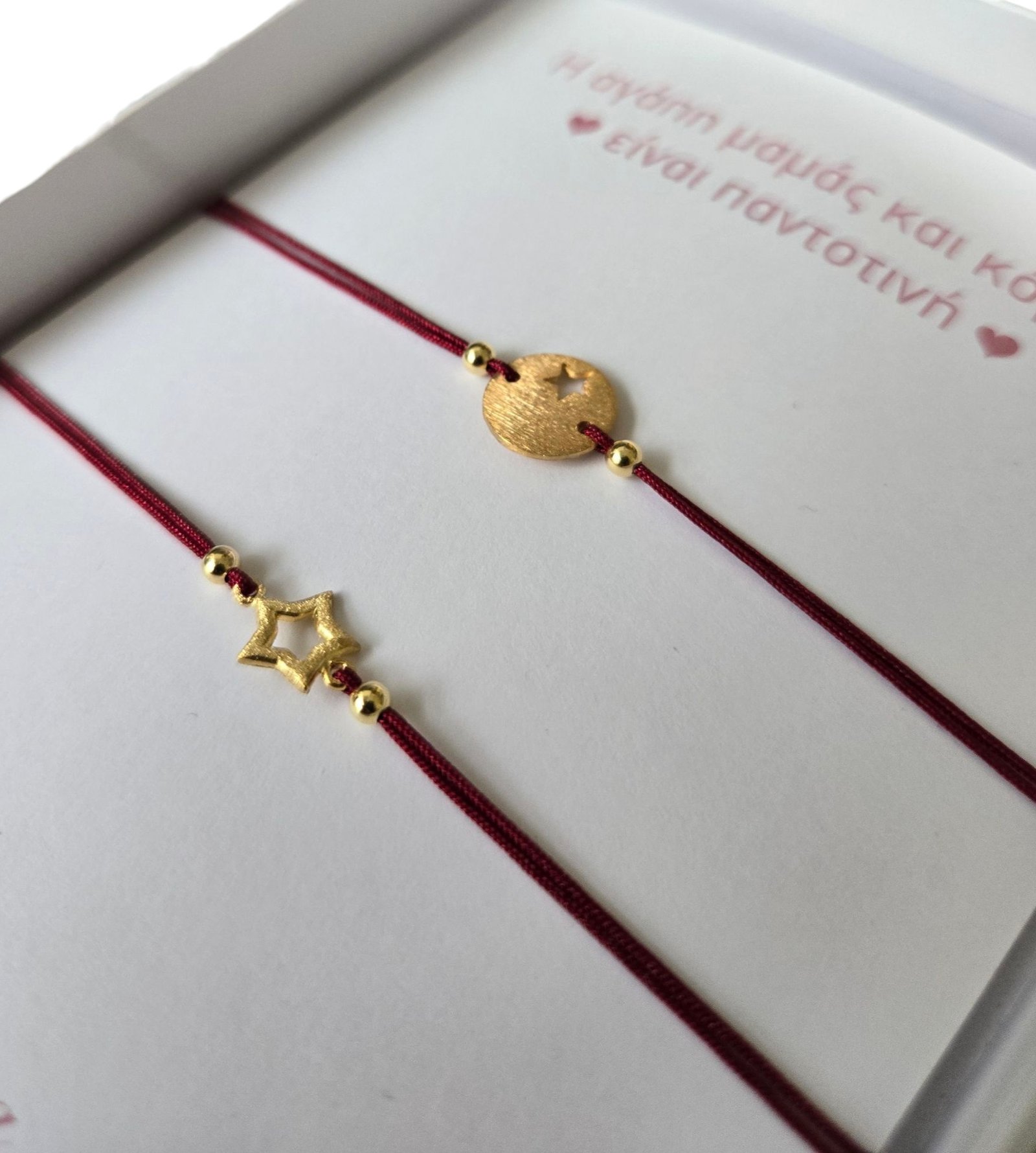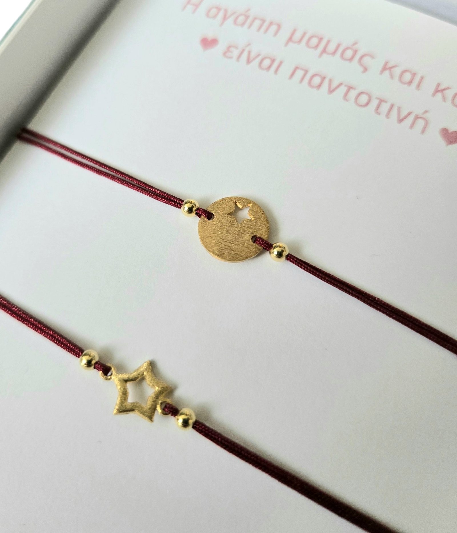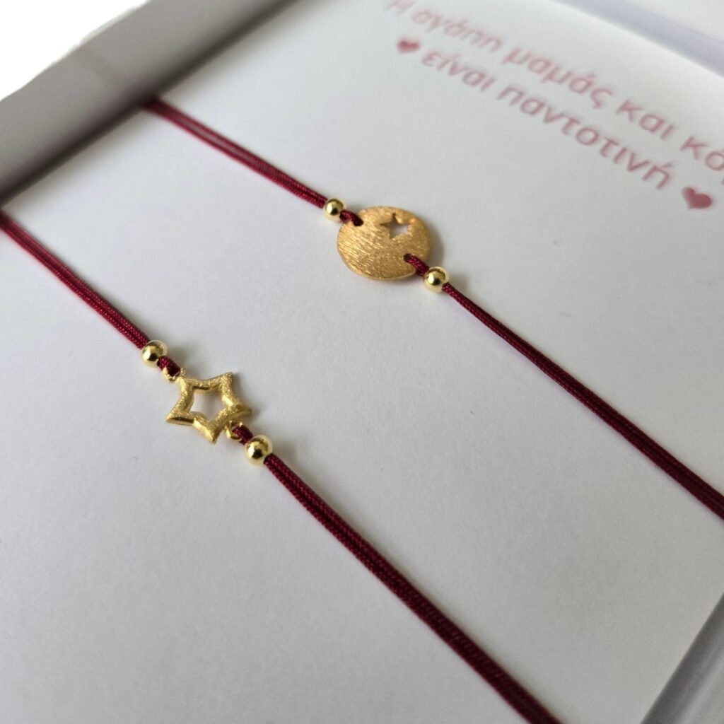 Το σετ βραχιολιών για μαμά και κόρη με σύμβολο το αστέρι, είναι μια τρυφερή επιλογή για να εκφράσετε τον ισχυρό δεσμό μεταξύ τους. Κάθε βραχιόλι είναι από επίχρυσο ασήμι 925. Σε κάθε βραχιόλι υπάρχει ένα όμορφο σύμβολο αστέρι, το οποίο εκφράζει την αγάπη και την στοργή ανάμεσα στη μαμά και την κόρη. Το κλείσιμο είναι με μακραμέ, για αντοχή αλλά και τη δυνατότητα αυξομείωσης του μεγέθους, ώστε να εφαρμόζει άνετα στον καρπό. Αυτό το σετ βραχιολιών είναι ένα συμβολικό κόσμημα που ενισχύει την ιδιαίτερη σχέση μητέρας και κόρης, δημιουργώντας πολύτιμες αναμνήσεις. Μαζί με κάρτα και κουτί δώρου.